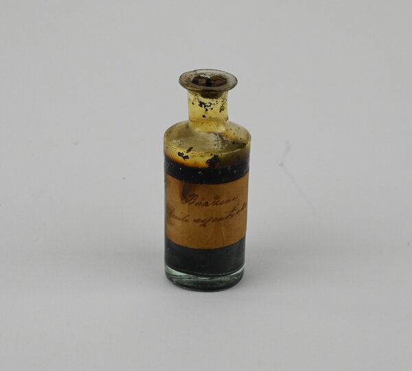 Prov på bensin. I flaska av glas med etikett: "Benzine huile essentielle".