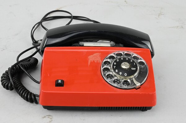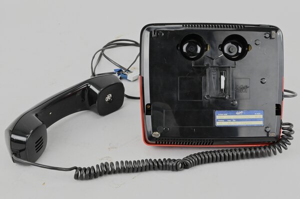 Telefonapparater Diavox 2 st, tillverkade år 1980, för AT-system, huvudapparat, anknytningsapparat till abonnentväxel och sidoapparat. Bordsmodell av plast med röd kåpa, svart mikrotelefon, fingerskiva, R-knapp för aktivering av tilläggstjänster under pågående samtal, högohmig reglerbar ringklocka, elektretmikrofon och elektronisk talkrets med automatisk dämpningskompensering.