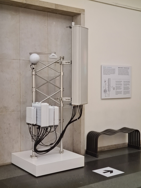Mast med delar som tillsammans utgör en basstation för 5G mobilnät. Högst upp på väggen sitter en Ericsson Radio Dot som är en integrerad radio och antenn. Till antennen kopplas radioenheterna (Radio 2217 och 4415), där signalerna mellan antennen och basbandet förstärks och anpassas till rätt radiofrekvenser.