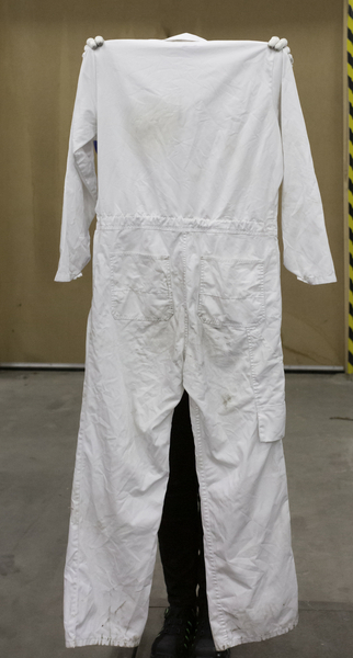 Skyddsoverall i vitt tyg, kypertvävt. Sammansättning 65% polyester, 35% bomull. Storlek C48. Två bröstfickor , två sidfickor och slitsar för att nå innanliggande kläder, två bakfickor samt en avlång benficka på höger ben. Gummiband för justering av midjemått. Tvåvägs dragkedja av metall märkt YKK.